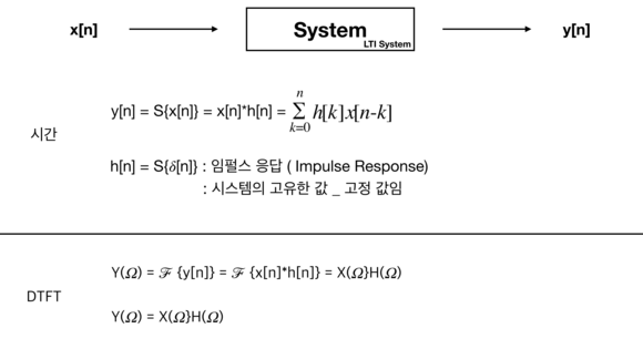 어떠한 시스템이 LTI System(인과 시불변 System)이라 했을 때 이 시스템을 통과하는 출력 y는 위와 같은 값을 가지게 된다. ‘*’ 는 곱셈 연산이