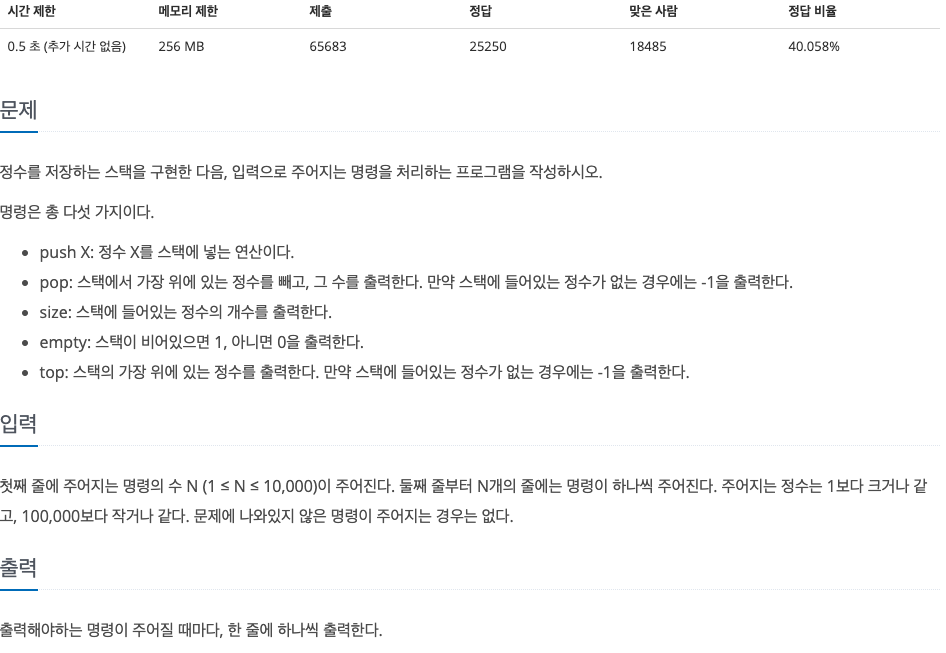 이번에는 백준 10828 문제를 가져왔는데요. 아주 기본적인 stack 문제이며 문제 제목도 "스택"이네요.