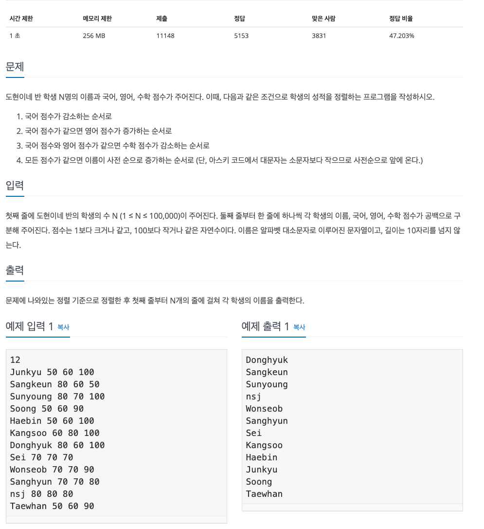 이번 문제는 백준 10825 국영수 라는 문제입니다.