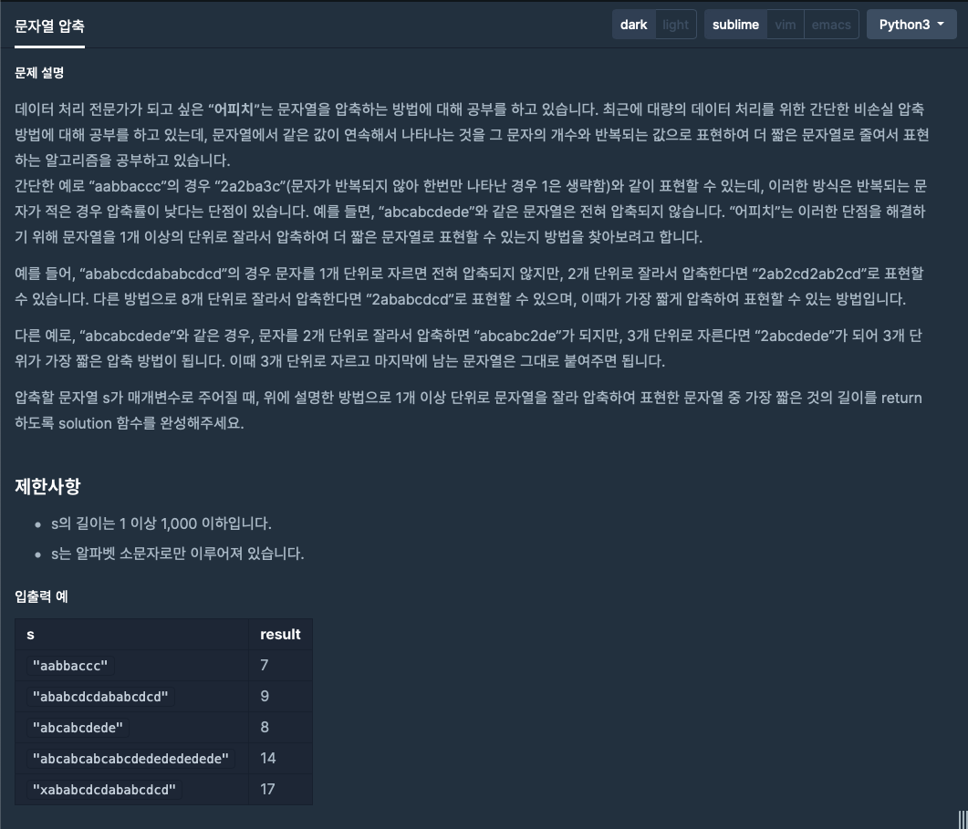 출시되었던 문자열 압축이란 문제입니다. 문제의 내용을 보면 다음과 같습니다.