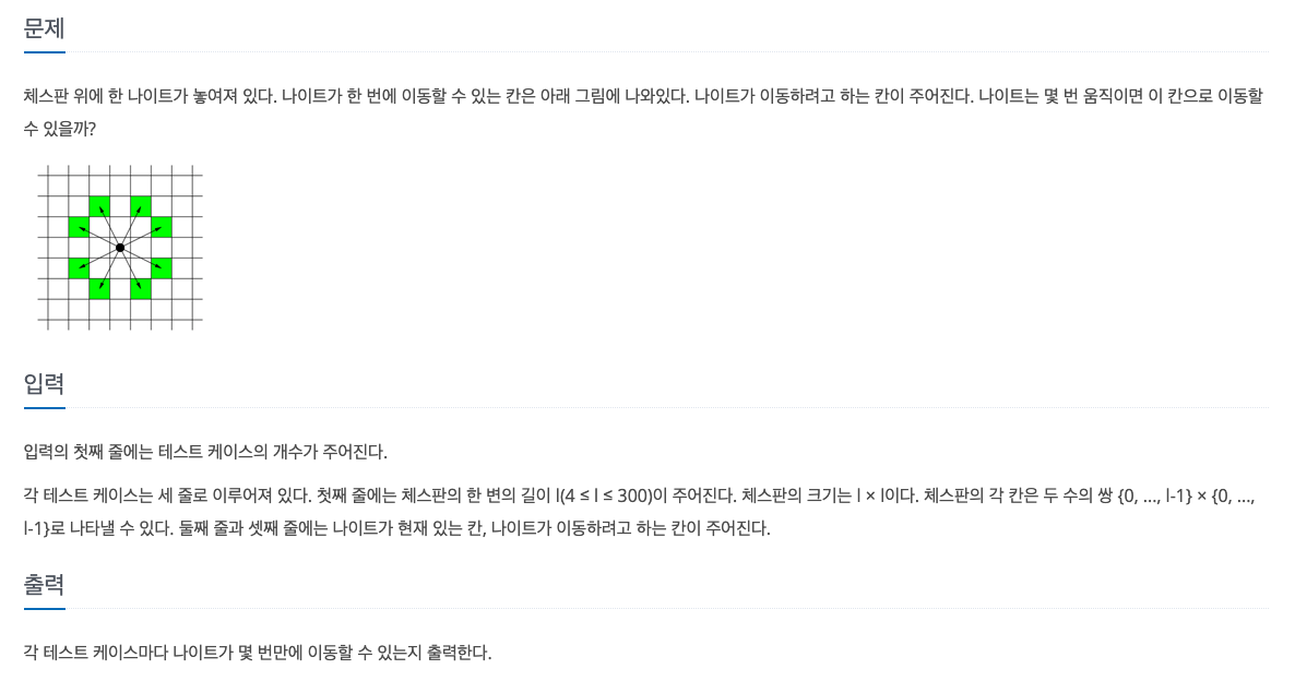 문제 체스판 위에 한 나이트가 놓여져 있다. 나이트가 한 번에 이동할 수 있는 칸은 아래 그림에 나와있다. 나이트가 이동하려고 하는 칸이 주어진다. 나이트는 몇 번 움직이면 이 칸으로 이동할 수 있을까? 입력 입력의 첫째 줄에는 테스트 케이스의 개수가 주어진다. 각 테스트 케이스는 세 줄로 이루어져 있다. 첫째 줄에는 체스판의 한 변의 길이 l(4 ≤ l ≤ 300)이 주어진다. 체스판의 크기는 l × l이다. 체스판의 각 칸은 두 수의 쌍 {0, ...