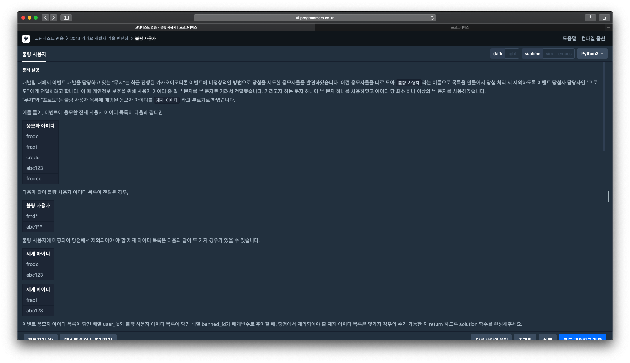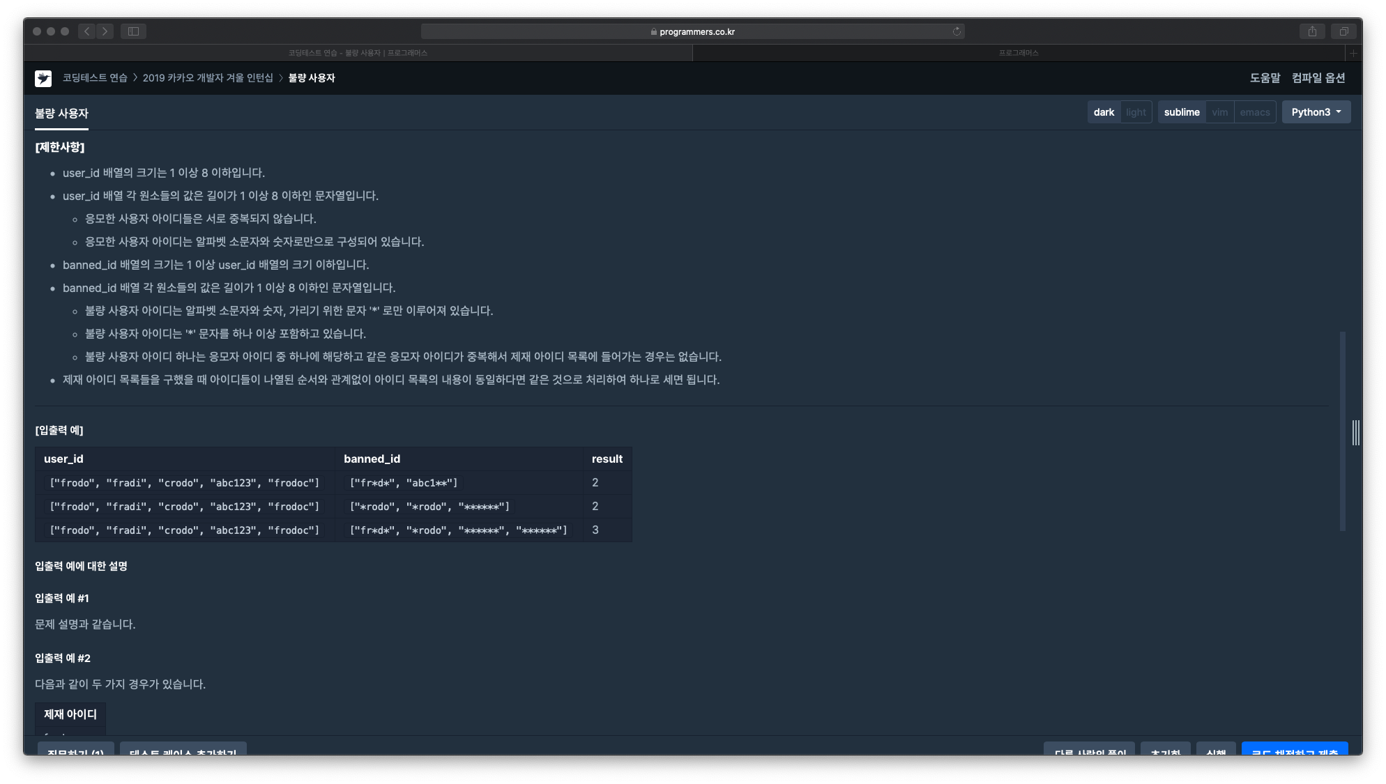 이번에 풀어볼 문제는 프로그래머스에 있는 불량사용자 라는 문제입니다.