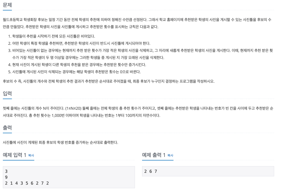 이번에 풀어볼 문제는 백준 1713번인 후보 추천하기라는 문제입니다.