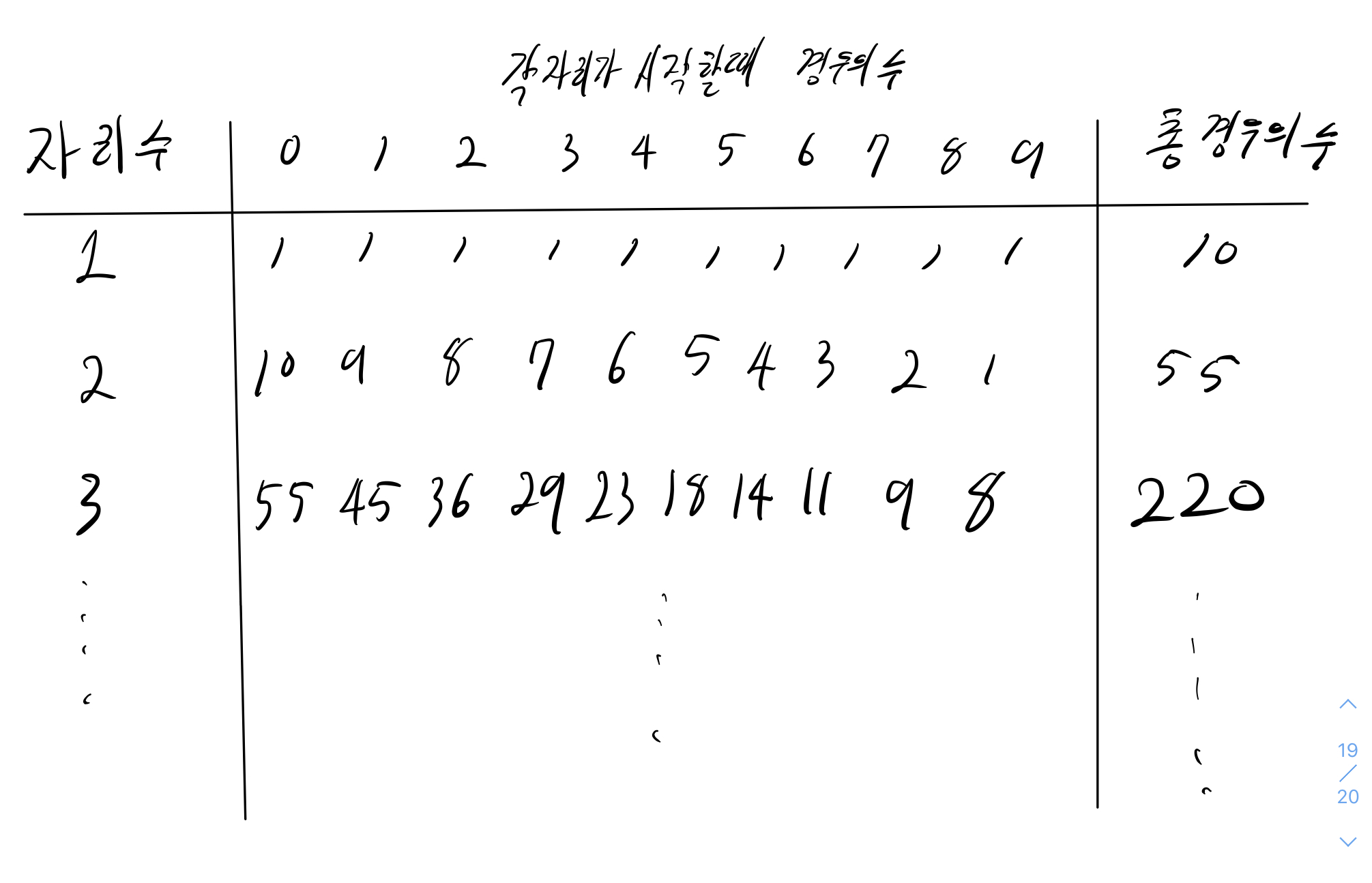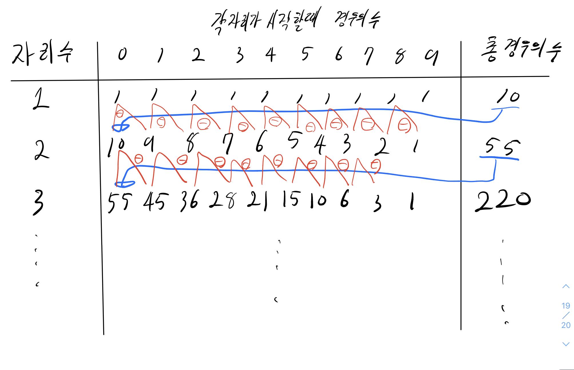 3의 자리수 부터는 뭔가 규칙이 보이기 시작합니다. 2의 자리수의 총 경우의 수 가 3의 자리수 중에서 0으로 시작하는 경우의 수 입니다.