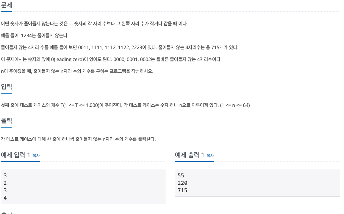 이번에 풀어볼 문제는 백준 2688번 문제인 '줄어들지 않아' 라는 문제입니다.