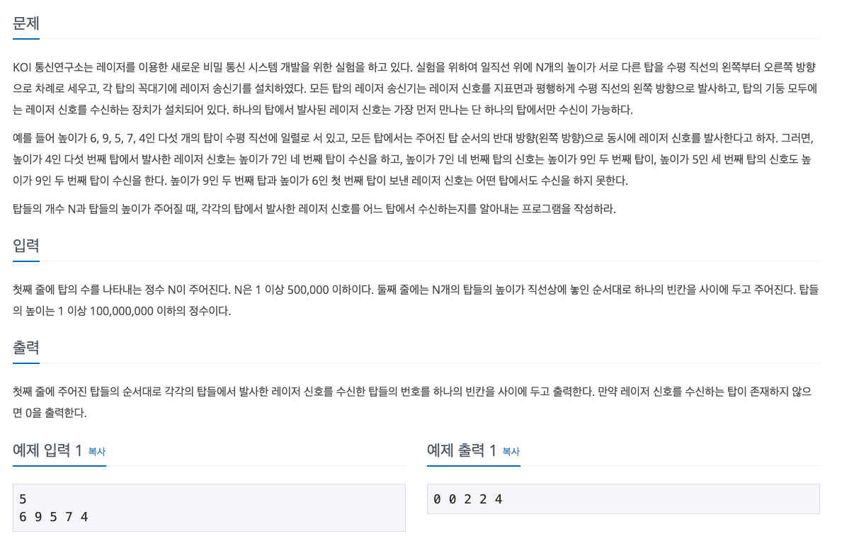 이번에 풀어볼 문제는 백준 2493번 '탑'이라는 문제입니다.