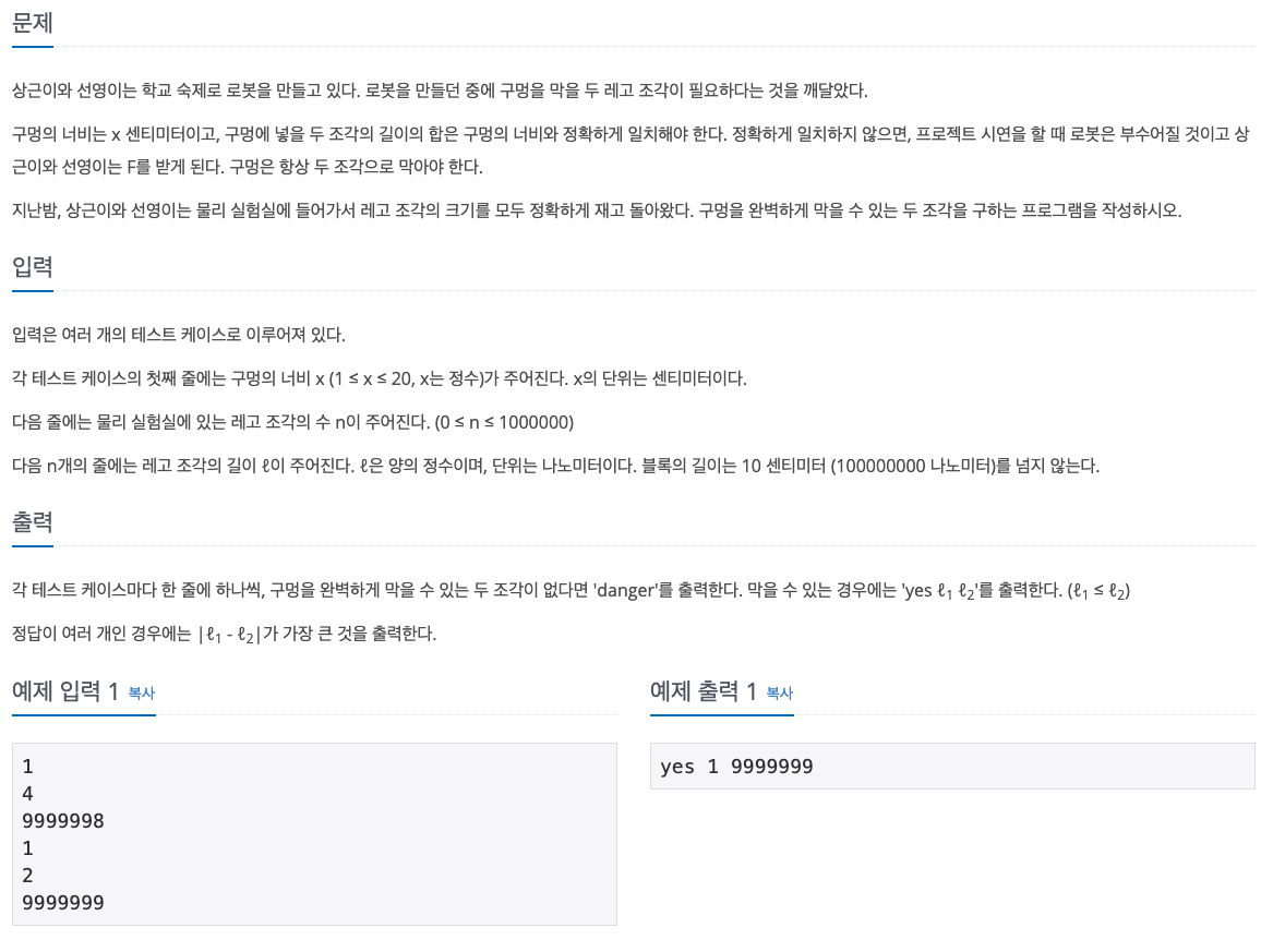 이번에 풀어볼 문제는 백준 3649번 '로봇 프로젝트'라는 문제입니다.