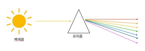 다음 그름을 한번 살펴보도록 하자. 백색광이 프리즘을 통과하여서 여러가지의 색의 빛으로 분류되는 모습이다.