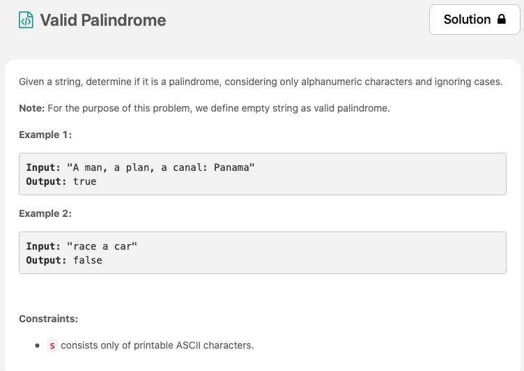 오늘의 문제는 Valid Palindrome 이라는 문제다. 즉, 필렌드롬이 맞는지 확인하는 문제다. 문제는 다음과 같다.