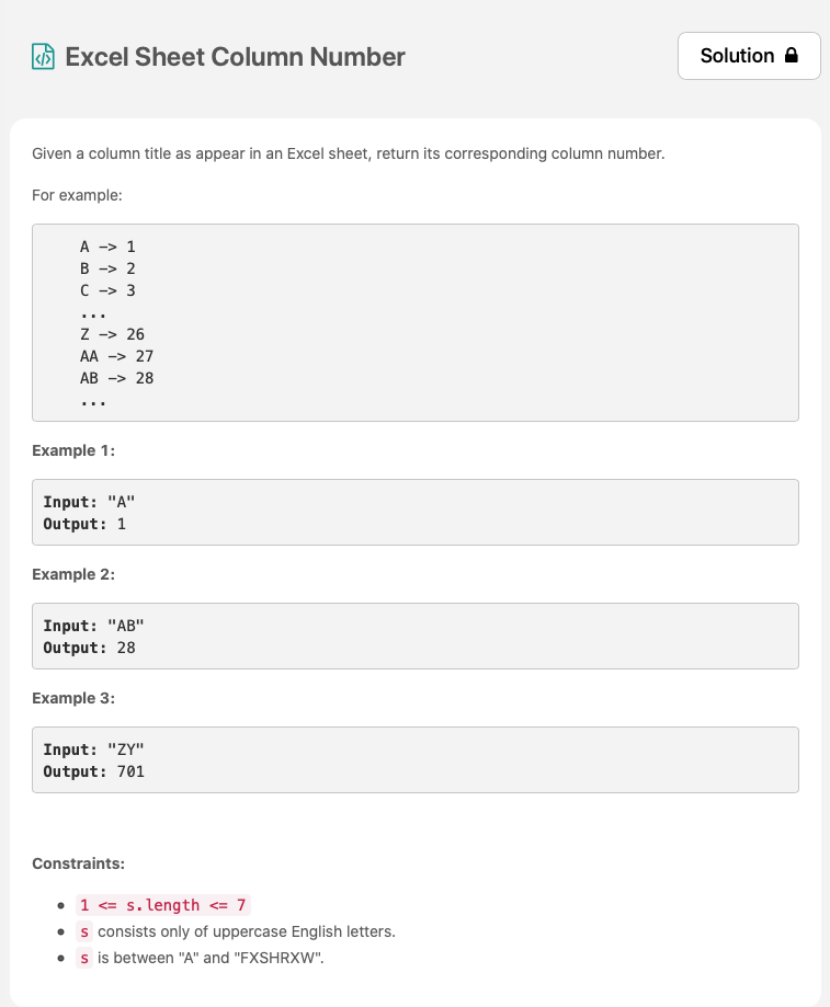 이번에 풀어볼 문제는Excel Sheet Column Number 라는 문제입니다.