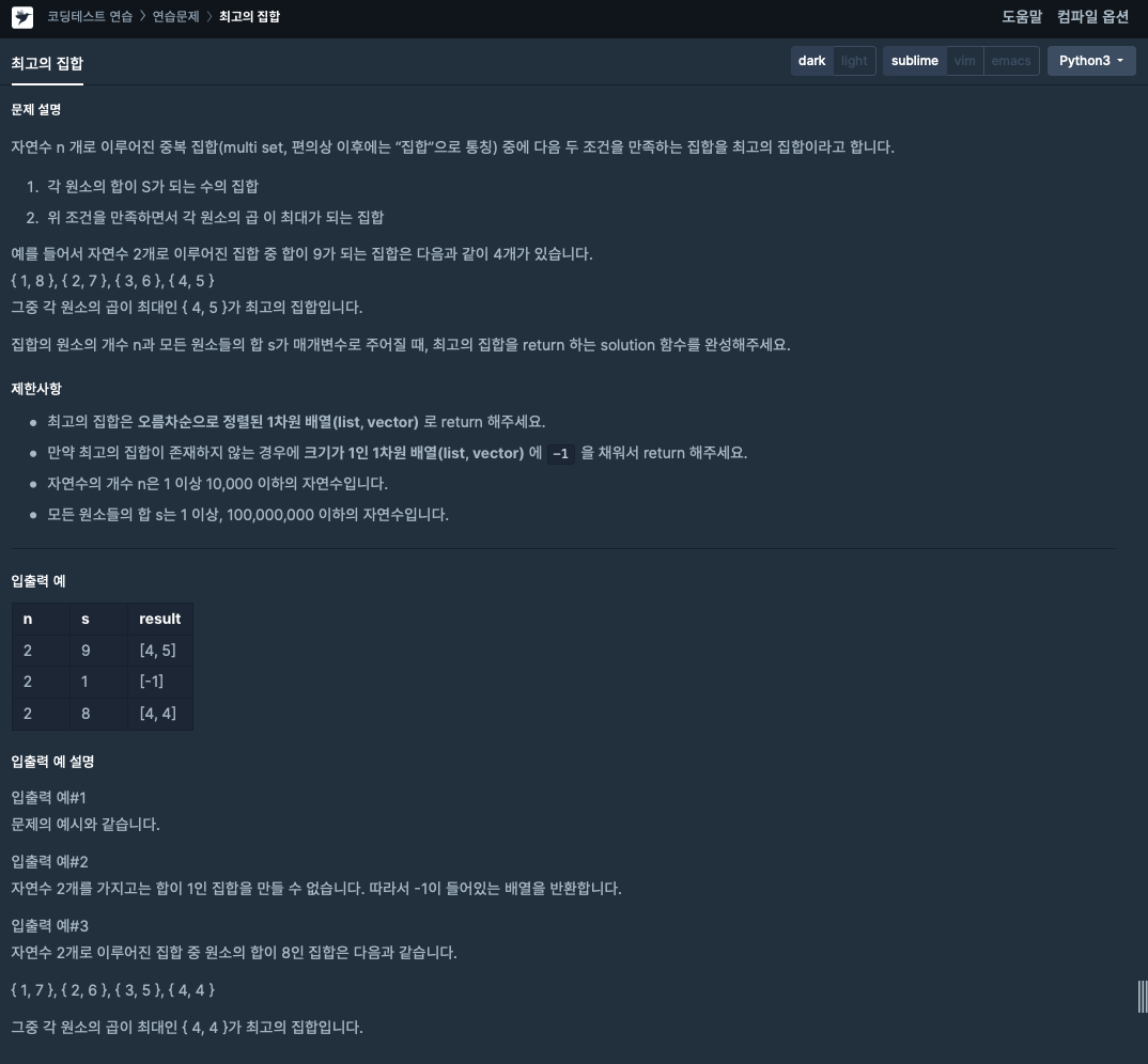 이번에 풀어볼 '최고의 집합'이란 문제는 s 라는 자연수를 n개의 자연수를 더해서 만드는 문제이다.