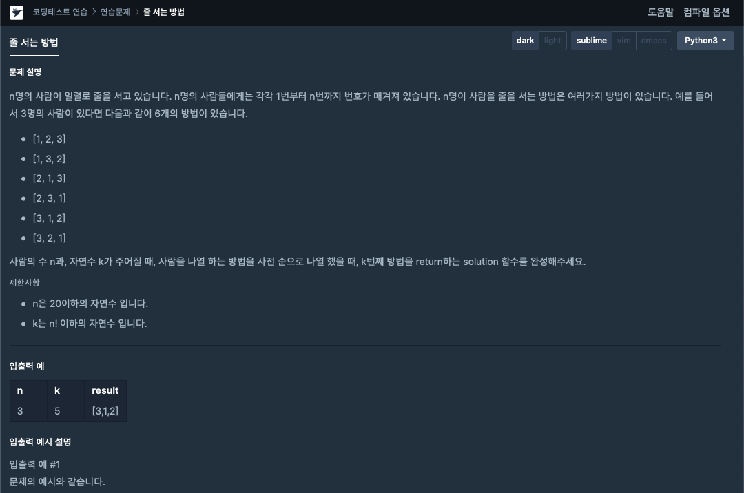 [Seop's의 코드풀이] 프로그래머스 줄 서는 방법 - Python 본문