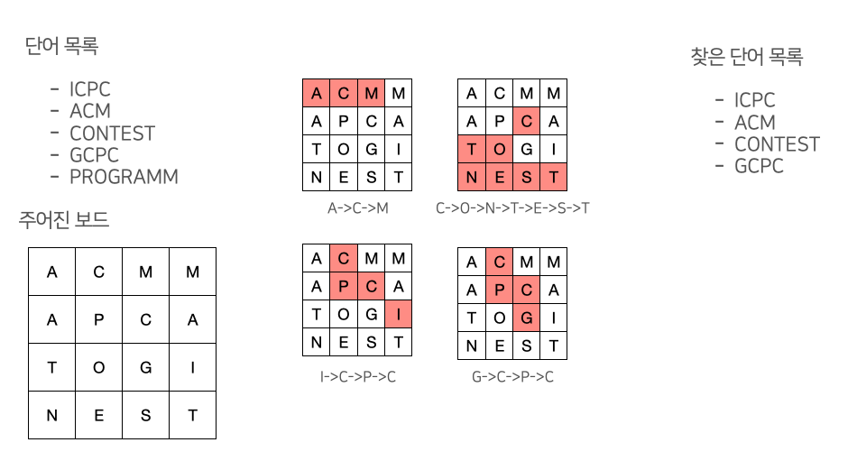 단어목록과 보드가 주어지면 이 안에서 단어목록에 있는 단어들을 찾으면 되는 것이다.