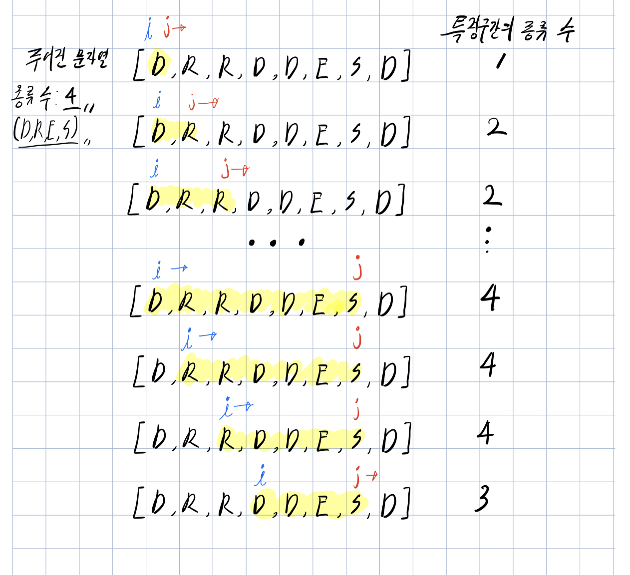 만약 현재 구간안에 있는 문자열의 종류의 수가 전체 문자열의 종류의 수보다 작다면 j(빨간)값을 증가 시키면서 탐색을 진행합니다.